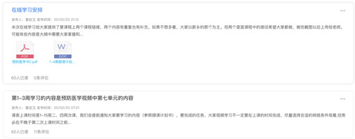 首先第一步选取合适的线上学习资源。好在学校推荐平台上正好有预防医学的慕课资源,而且也是跟我们差不多的时间开课,看介绍和我们的教材也比较贴合,资源的问题解决了。接下来就是要考虑如何保证同学们的学习效果。考虑到慕课堂和课堂派都能记录学生学习情况,而且各有优势,慕课堂用来客观记录同学们观看视频学习的情况,课堂派能够主观掌握同学们的学习情况,而且互动也比较方便。于是在开课前一周,我在两个平台上都建好了课堂,把一些教学资料和教学计划都发到课堂里面,开始先让班干部加入实验一下,自己熟悉操作,然后让班干部督促辅导同学们都加入到课堂当中。加入的同学们有些表现的很积极,马上就开始看视频,但不知道要怎么学习,我就把更为详尽的教学计划发到公告中,方便同学们学习。