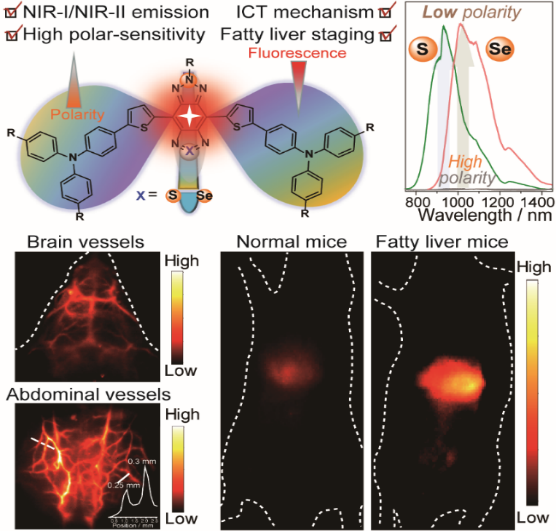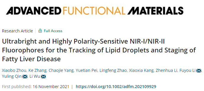 近日,我院吴丽教授团队以yl23455永利集团为第一和通讯作者单位,在国际权威期刊《先进功能材料》上发表题为“Ultrabright and Highly Polarity-Sensitive NIR-I/NIR-II Fluorophores for the Tracking of Lipid Droplets and Staging of Fatty Liver Disease(超亮极性敏感的NIR-I/NIR-II发光分子用于细胞内酯滴的示踪和脂肪肝疾病的分期)”的学术论文,首次提出了NIR-I/NIR-II发光的酯滴检测探针构建策略,实现了对活体深层组织中细胞内酯滴的实时快速检测。我院周晓波博士为第一作者,吴丽教授、秦玉岭教授为共同通讯作者。