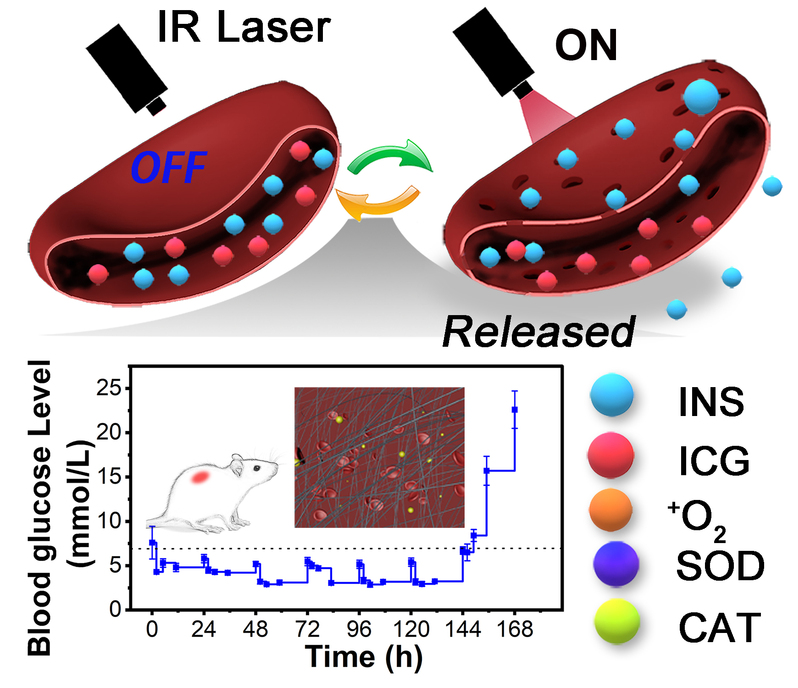 1型糖尿病和部分2型糖尿病患者需要频繁皮下注射胰岛素来控制血糖,这种给药方式引起的疼痛严重降低了病人的生活质量。夏栋林团队利用红细胞(ER)作为药物的载体、吲哚青绿(ICG)作为响应开关、氨基酸水凝胶作为支架,构建了一种体外红外激光控制释放的载药平台(INS-ICG@ER hydrogel),实现了皮下注射后无痛精准控制胰岛素释放,有效缓解了病人疼痛,为无痛给药提供了一种新研究思路。