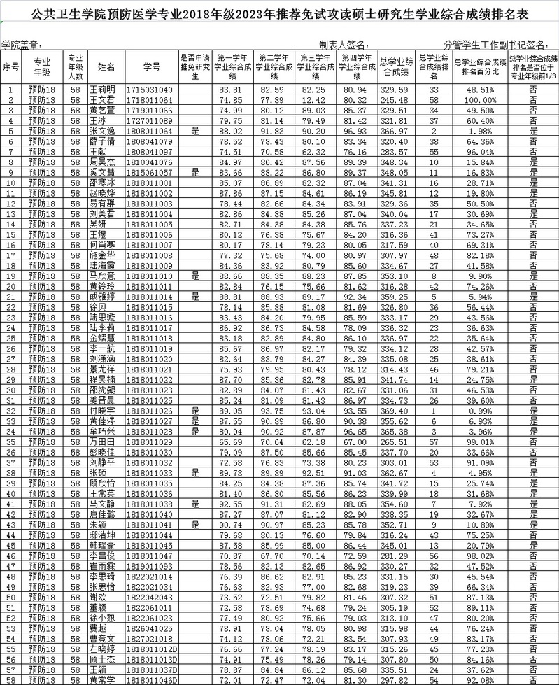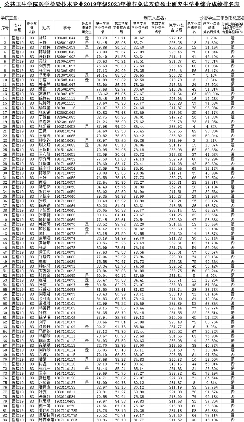 现将《推荐免试攻读硕士学位研究生综合测评成绩排名表》予以公示,敬请大家监督。