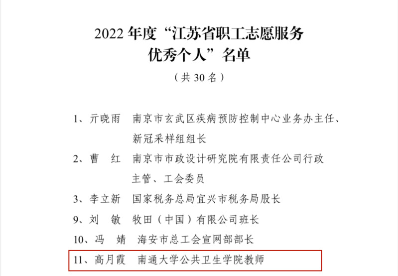 近日,江苏省总工会印发《关于2022年度江苏省职工志愿服务先进典型的通报》,我院高月霞老师获评为2022年度“江苏省职工志愿服务优秀个人”。