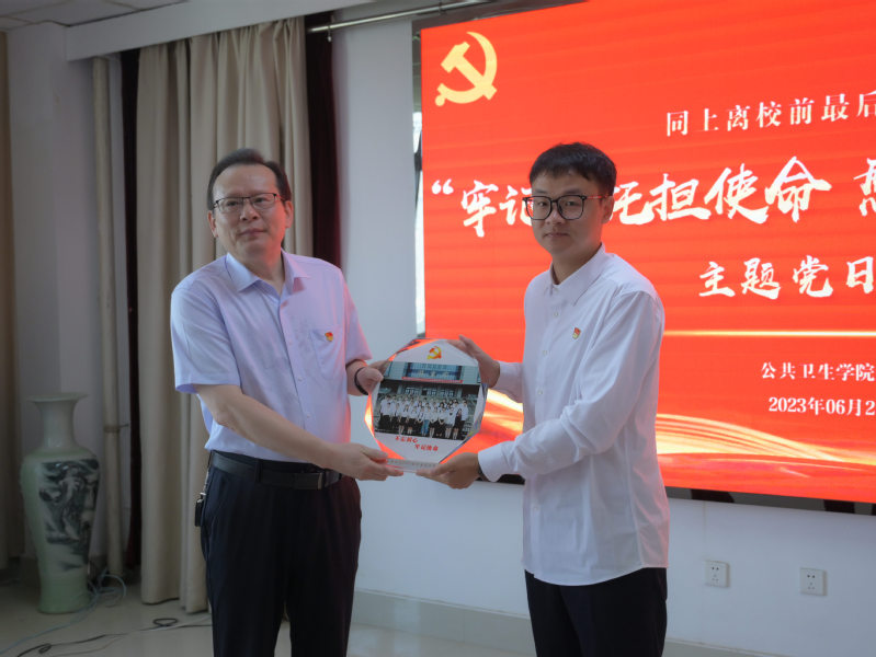 杨敏在主持讲话中勉励同学们永怀入党初心,坚定不移听党话、跟党走,不断强化党性修养,勇立时代潮头,在前进道路上砥砺前行、奋发有为,将个人理想追求融入国家与民族的事业发展中去,敢为人先、敢于突破,以聪明才智贡献国家,以开拓进取服务社会,为祖国公共卫生事业的发展和人民健康贡献青春力量。