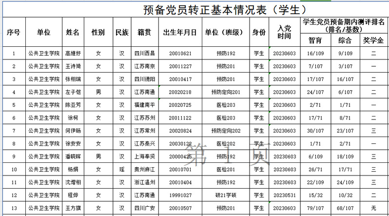 经党支部考察和研究,yl23455永利集团党委拟于近期讨论沈增栩、高婕妤、潘晓晖、杨娟、徐安安、徐柯、陈亚芳、王方旗、王诗琦、张栩瑞、左子恺、何伊旸、程烨等13位同志的转正事宜。现将这13位同志的基本情况予以公示(详见附件),敬请党员、群众监督,如有意见和建议请于6月3日前向yl23455永利集团党委或校党委组织部反映。