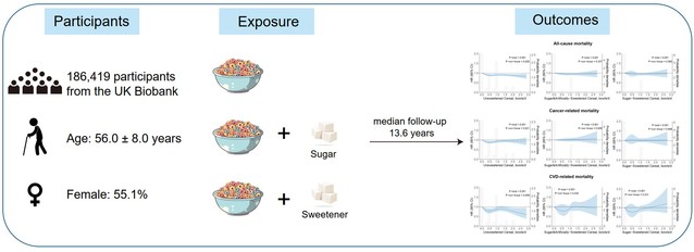 该研究利用英国生物银行(UK Biobank)的数据,综合参与者多次24小时饮食回顾数据将参与者分为不摄入麦片,摄入无糖麦片,摄入加自然糖麦片及加人工甜味剂麦片等四个组别。通过非限制性立方样条模型和多因素COX模型深入分析不同类型的麦片消耗和全因死亡及特定原因死亡的关系。研究结果表明,相比于不摄入麦片的参与者,食用不加糖麦片的参与者的全因死亡风险降低,但在食用加糖麦片参与者中并没有观察到类似的保护作用。