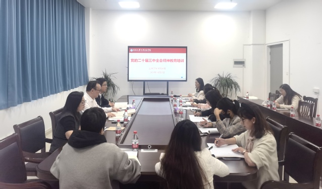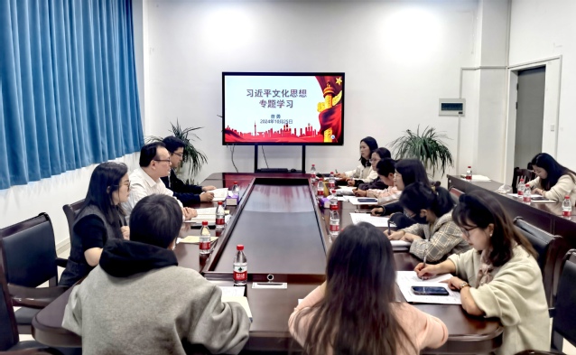 曹勇带领大家深入学习了《中共中央关于进一步全面深化改革、推进中国式现代化的决定》第10部分“深化文化体制机制改革”以及习近平文化思想的核心内涵。他指出,习近平文化思想科学且系统地回应了我国社会主义文化强国建设中众多基础性、根本性和长远性的问题,为以中国式现代化全面推进中华民族伟大复兴提供了坚实的思想武器和科学的行动指南。在新时代,高校秉持“为党育人、为国育才”的理念,承担着文化传承发展的重要职能。为此,他提出三点要求:一是要站在统筹推进“五位一体”总体布局的高度,自觉承担起文化建设和文化育人的职责,将习近平文化思想融入人才培养全过程。二是要站在为国家立心、为民族立魂的高度,始终将意识形态工作作为党的极端重要工作来抓,将维护好社会主义意识形态的要求贯穿于人才培养、科学研究、社会服务和文化传承发展之中。三是要自觉肩负起举旗帜、聚民心、育新人、兴文化、展形象的使命任务,将习近平文化思想研究成果运用到教育教学实践之中,把理论研究成果转化为立德树人成效。