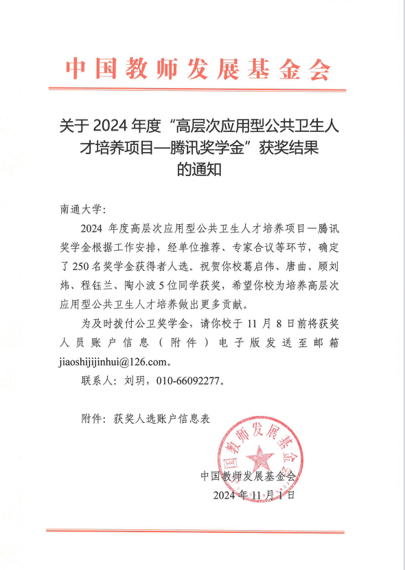 根据2024年度高层次应用型公共卫生人才培养项目——腾讯奖学金工作安排,经单位推荐、专家合议等环节,确定