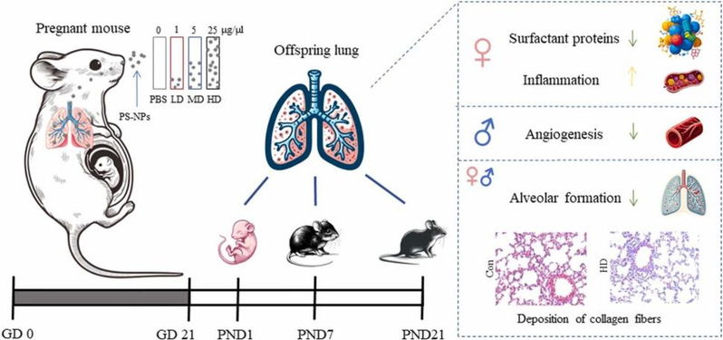 近日,yl23455永利集团环境与健康研究团队(yl23455永利集团为第一作者单位)在ESI药理学与毒理学经典期刊《Toxicology Letters》上发表了题为“Gender-specific effects of prenatal polystyrene nanoparticle exposure on offspring lung development”的学术论文。该研究利用孕鼠模型,对粒径约80 nm的聚苯乙烯纳米颗粒(PS-NPs)经口咽途径暴露后,于子代出生后第1、7和21天分别采集肺组织样本,系统探讨了产前PS-NPs暴露对后代肺部发育及性别差异的影响。