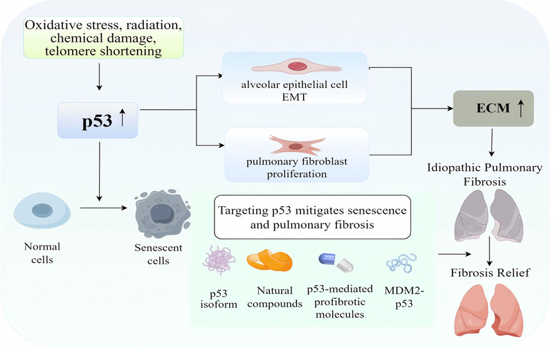 文章指出,p53是一种著名的肿瘤抑制因子,在维持基因组稳定性和决定细胞命运方面发挥着核心作用。突变或功能异常的p53 DNA结合域(DBD)会导致细胞周期阻滞、DNA损伤修复障碍、细胞凋亡和细胞衰老等过程。研究阐明,持续的DNA损伤会触发衰老相关分泌表型(senescence-associated secretory phenotype, SASP)的激活,促进包括PAI-1和TGF-β在内的多种因子的释放。这些因子通过旁分泌信号激活肺组织中的成纤维细胞,导致过多的细胞外基质 (extracellular matrix, ECM)沉积,最终引发肺纤维化。在治疗策略探索方面,文章系统梳理了当前靶向p53通路的上下游分子以及具有调控潜力的天然化合物等研究进展,强调了靶向p53通路作为未来肺纤维化治疗新策略的巨大潜力。