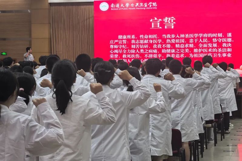 “我志愿献身医学,热爱祖国,忠于人民,恪守医德,尊师守纪,刻苦钻研,孜孜不倦,精益求精,全面发展……”随后,学院举行了庄严的宣誓仪式,在学院副院长(主持工作)褚敏捷的带领下,全体新生肃然起立,高举右拳,声声誓言,字字铿锵,表达了为祖国公共卫生事业和人类身心健康奋斗终身的坚定决心与崇高理想。
