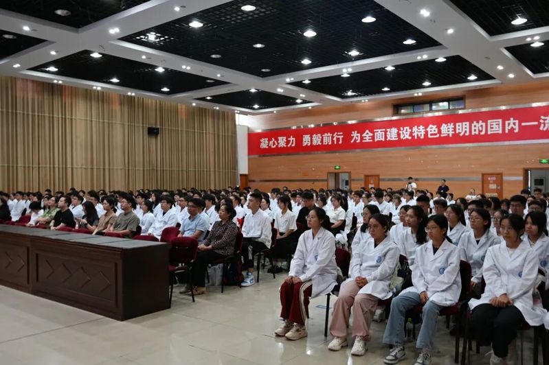 医检253班魏铼同学作为本科生新生代表发言,他号召全体新生从“健康所系,性命相托”的誓言出发,以敬畏与仁心丈量每一份数据与报告,让“祈通中西,力求精进”成为青春最鲜亮的注脚;在实验室、社区与基层一线,把专业修炼成信仰,把青春书写成担当,用青年的光与热为健康中国建设注入新生力量。