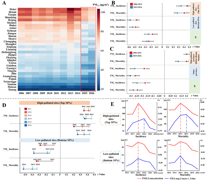 本研究由yl23455永利集团联合北京大学、复旦大学、中国地质大学、江苏省人民医院等多家机构合作完成。团队整合了全国537个监测点(覆盖31个省、市、自治区)的长期肺癌监测数据、气象再分析数据及高分辨率大气颗粒物数据,综合运用多种统计分析方法系统解析了气候因素联合大气污染物对肺癌发病率及死亡率的影响。研究发现,在全国范围内,环境温度与女性肺癌发病率及死亡率呈显著负相关,即温度越低的地区,女性肺癌的发病与死亡风险越高,该结论在日本、印度和英国等多个国家中得到一致验证。分层分析进一步揭示,在空气污染较重的区域,温度与肺癌的关联发生逆转,表现为显著正相关。值得注意的是,自2013年国务院发布《大气污染防治行动计划》以来,我国颗粒物浓度自2014年起持续下降,相应地,高污染地区温度与肺癌之间的正向关联也明显减弱。