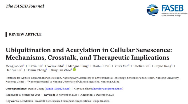 近日,我院环境与健康研究团队(南通市环境毒理学重点实验室)在国际学术期刊《The FASEB Journal》(IF:4.4,中科院生物学二区)上发表了题为 《Ubiquitination and Acetylation in Cellular Senescence: Mechanisms, Crosstalk, and Therapeutic Implications》 的学术论文。该研究系统梳理了泛素化(ubiquitination)与乙酰化(acetylation)两类关键赖氨酸翻译后修饰在细胞衰老调控中的作用机制及其相互作用网络,为衰老相关疾病的干预策略提供了新的理论依据。