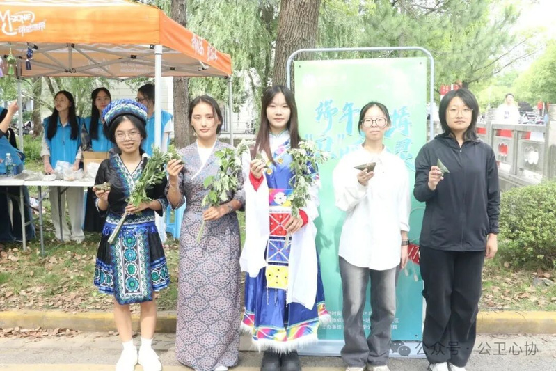 在“粽香传情”区,专业师傅手把手教授学生包粽子技巧,从折叶、填料到扎绳,同学们在劳动中感受“一叶一黍总关情”的文化温度,品味传承千年的味道。在“香囊蕴福”区,丝线穿梭于素缎之间,艾草、菖蒲与白芷的清香随着细密针脚封存入锦囊,既承古法驱邪避疫之智,又寄今朝身心安宁之愿。在“漆扇绘梦”区,非遗漆艺与现代美学碰撞,斑斓漆色在扇面流淌,绘就青春独有的诗意。在“彩绳寄愿”区,同学们将代表“金木水火土”五行的彩线编成手链,既承载驱邪避疫的传统寓意,又将平安顺遂的祈愿编入每一道结扣。在“艾草盈门”区,师生共同扎制艾草花束,清香四溢间传递着对健康的守护与关怀。
