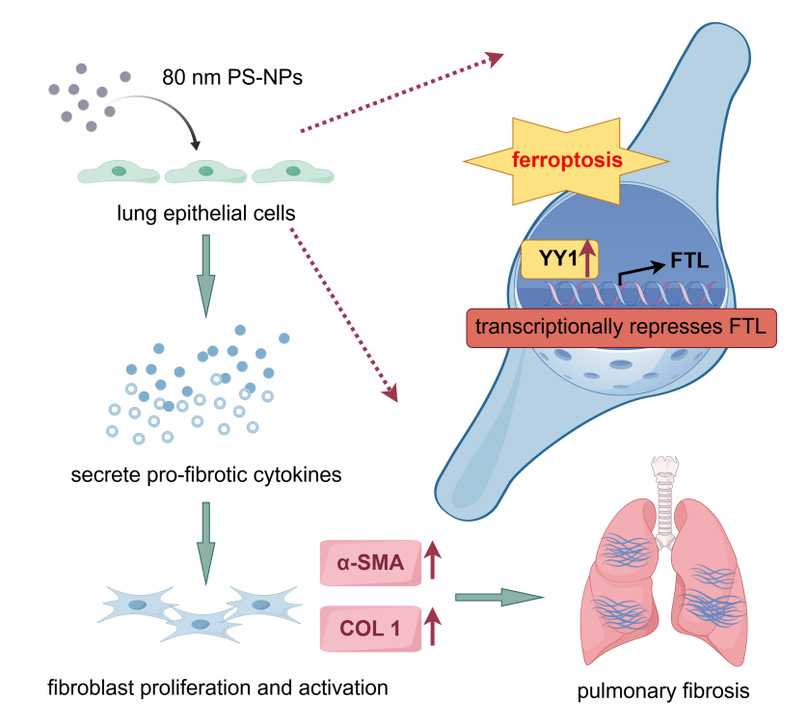 在分子调控层面,研究发现转录因子YY1可结合FTL启动子并抑制其表达;敲低YY1后,上皮细胞铁死亡水平下降,肺纤维化相关表型亦得到明显缓解。该研究提出YY1/FTL轴介导的铁死亡是PS-NPs促发肺纤维化的关键机制,为理解纳米塑料相关肺损伤及潜在干预策略提供了新的理论依据与实验支撑。