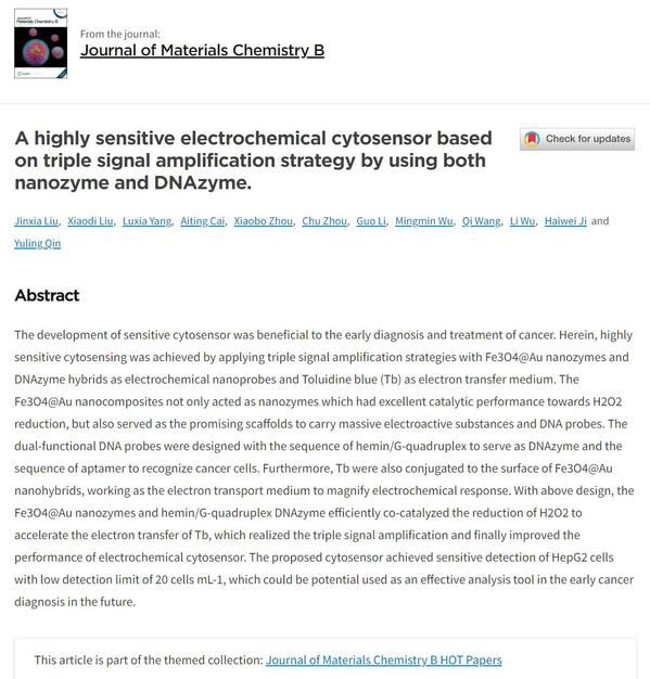祝贺刘金霞老师文章被Journal of Materials Chemistry B (Hot Paper)接收!