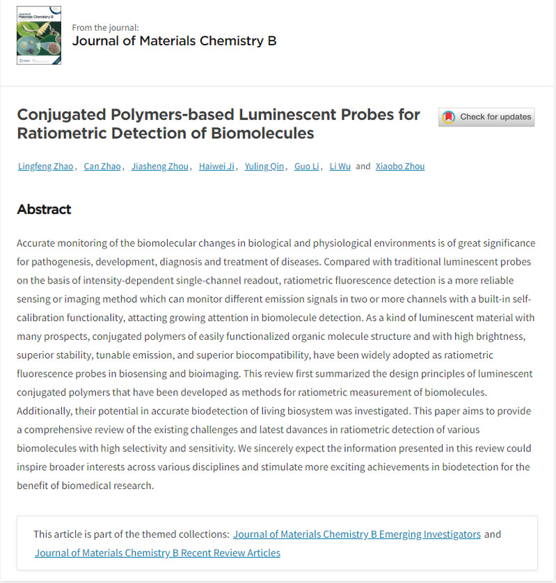 该Review入选Themed collection: Journal of Materials Chemistry B Emerging Investigators,入选依据是“Journal of Materials Chemistry B is pleased to present this themed issue highlighting the rising stars of materials chemistry research in 2022. This issue showcases the very best work from materials chemists in the early stages of their independent career.”恭喜赵凌峰同学!